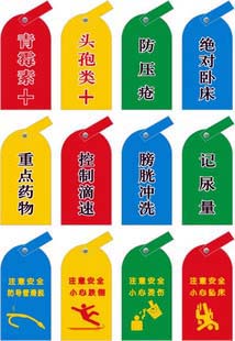 护理安全警示标识双层塑料高频机烫压而成,规格:5*9.5cm,扣带长13.5cm,单价0.65元,警示标识的使用能够对护患双方起到警示作用,对病人及家属提出告知,对护理人员是一个警示,也提醒病区其他工作人员高度警惕的目的,保证了病人在住院期间的安全,提高了护理服务质量并为保证护理安全起到一定的作用。