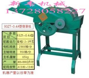 广东新丰机械设备有限公司新近开发生产一种使用于中小型饲养场的小型系列铡切草机,型号;93ZT-0.4型,可应用于各种农作物秸杆的切碎,长度有长、有短,其结构紧凑耐用,全部采用钢球轴承运转,齿轮传动,加装吃草装置,生产效率高,安全可靠,配2.2--3.0千瓦电动机,装配定制的65号锰钢刀片,220伏380伏电压两种都可使用.