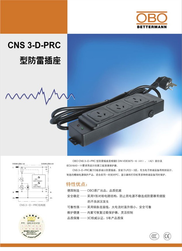 OBO CNS 3-D-PRC(D级防雷插座,安装于LPZ2-3区)为计算机、监视器和打印机等终端设备特别设计、制造的精密浪涌保护产品,可对所有插座连接的终端设备提供保护。