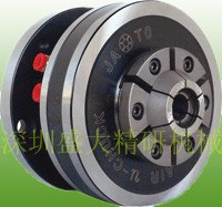 朝铨JAP100精密气压膜片夹盘采用专利膜片夹盘技术.重复精度可以高达0.002mm.适合各式精密工件的夹持加工.其夹持力能以气压精密微调.因此也非常适合夹持薄型工件或脆弱工件.不会造成破坏变形.JAP100精密气压膜片夹盘内藏高性能气压回转缸.转速可达5000RPM.与一般精密夹头相较.选用JAP100气压膜片夹盘可以节省安装气压回转缸.给气钢管等组件.安装容易.操作简单.JAP100精密气压膜片夹盘应特点