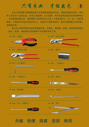 8、钛合金工具:特点是本工具无磁性,在很强的磁场中也不会被磁化,在高温600℃时不会变形,同样在低温-250℃时仍能保持较好的韧性。工具的耐腐蚀性能高于不锈钢;无污染、无辐射是世界上最高级也是唯一的环保型工具。钛合金工具的主要特点是:重量轻,强度好、不生锈、无毒、抗冲击性强。是航空理想的随机工具、军工的随车工具、航海的随船工具、同样也是理想的机械维修工具,钛工具在本身的显著特性是任何工具不能替代。我公司将为您提供规格齐全的钛工具产品,并可根据客户的不同需求订做。