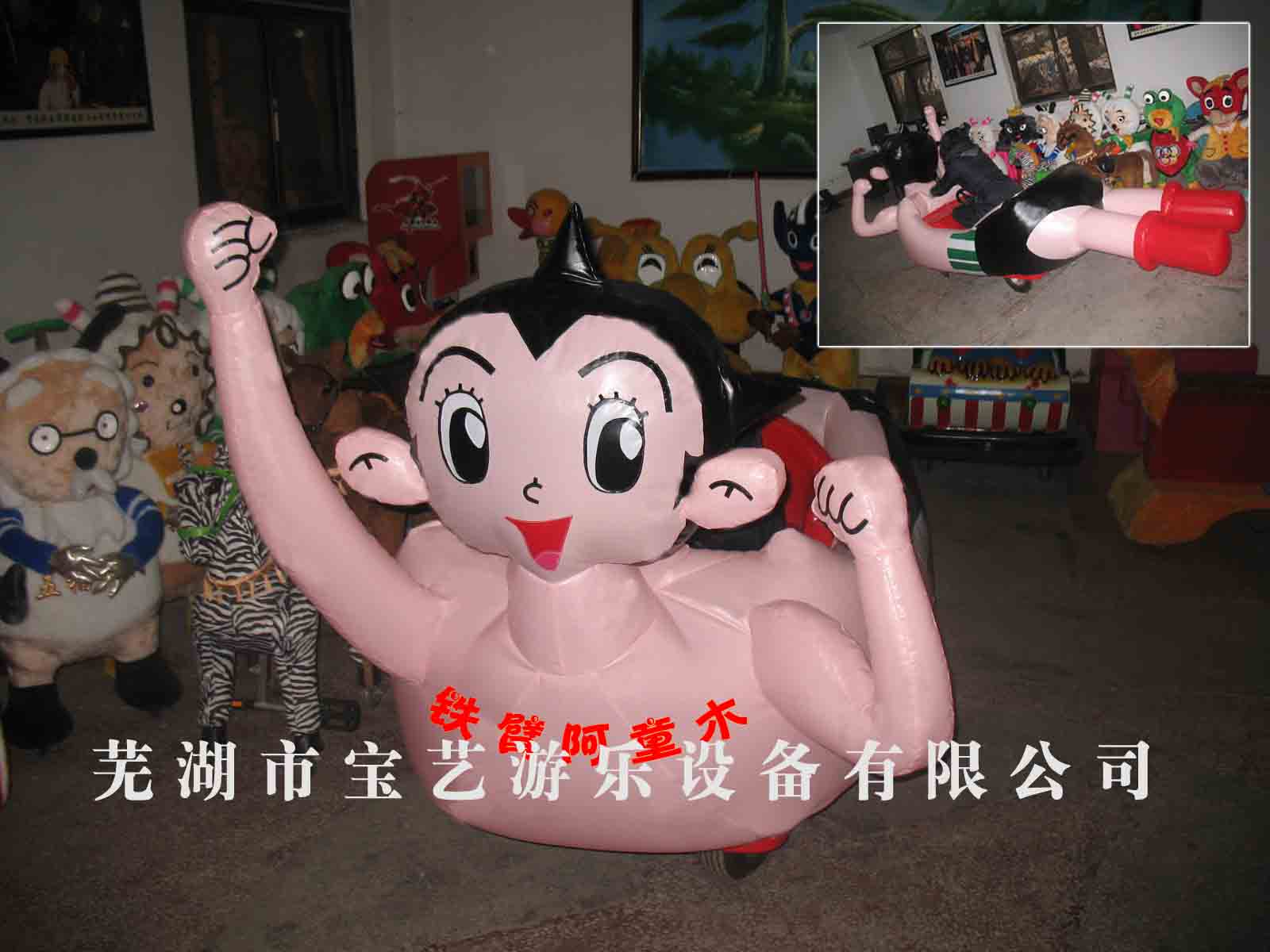 我公司生产的充气电瓶车分为大、小两种型号,外壳采用玻璃钢材质制成;小型充气电瓶车使用12V直流减速电机,大型充气电瓶车使用24V直流减速电机,并设有快慢档、倒车(配有倒车提示音)刹车、喇叭等功能;配置宝川牌智能控制器,可计时、调速、音乐、数字显示等功能;轮胎为高效耐磨型充气轮胎;内部为标准钢架结构;外套采用PVC加厚牛津亮光布料制成,具有耐磨、鲜艳、美观、易清洗、不褪色等特点;并配有双鼓风机。