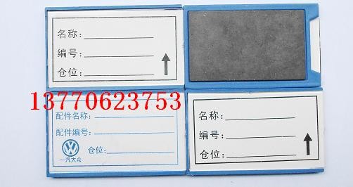 仓库标牌、磁性标签卡、磁性库位卡、标牌--1 3 7 7 0 6 2 3 7 5 3/0 2 5 8 5 5 6 1 5 7 5/0 2 5 8 3 3 6 4 7 2 1/1 3 3 8 2 7 6 1 7 3 6/1 3 3 8 2 0 0 2 1 8 3由ABS工程塑料制成,广泛应用于机关、部队、企事业单位的仓储管理。它背面特有的强磁材料,可以直接吸附在货架上,下部有记录库成量的转盘,规格有A、B、C、D、E、F、G、H、等,可以使它直接吸附在铁质货架上,上半部份插卡片,记录材料名称、规格、型号,下半部份转盘显示库存数量,转盘有定位,有A型、B型、C型、D型、E型、F型、G型、H型、K型,E型可以直接记录入库、出库、库存量,适用于企业的认证、升级、创一流。该产品经全国各地供电局、电厂、炼油厂、钢铁厂、造纸厂、电子企业、机械制造业、自来水公司等单位使用效果良好