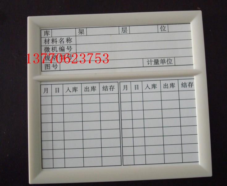 磁性材料卡、仓库标牌、磁性标签卡、磁性库位卡--1 3 7 7 0 6 2 3 7 5 3/0 2 5 8 5 5 6 1 5 7 5/0 2 5 8 3 3 6 4 7 2 1/1 3 3 8 2 7 6 1 7 3 6/1 3 3 8 2 0 0 2 1 8 3由ABS工程塑料制成,广泛应用于机关、部队、企事业单位的仓储管理。它背面特有的强磁材料,可以直接吸附在货架上,下部有记录库成量的转盘,规格有A、B、C、D、E、F、G、H、等,可以使它直接吸附在铁质货架上,上半部份插卡片,记录材料名称、规格、型号,下半部份转盘显示库存数量,转盘有定位,有A型、B型、C型、D型、E型、F型、G型、H型、K型,E型可以直接记录入库、出库、库存量,适用于企业的认证、升级、创一流。该产品经全国各地供电局、电厂、炼油厂、钢铁厂、造纸厂、电子企业、机械制造业、自来水公司等单位使用效果良好.