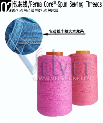 “VELVET”牌包芯线是采用涤纶短纤包覆涤纶长丝的出口材料.包芯线既有涤纶短纤的外观以及低收缩的功能又因加入涤纶长丝增强了本产品的拉力.由于包芯线用于牛仔洗水效果优于普通SP线(见图)不起毛,不断线,广泛应用于欧美以及国外牛仔成衣企业.为了提高生产效率,很多成衣企业的高速针车达到5000转/分钟以上的速度,普通SP线因不能耐高热或拉力不够断线,所以最理想的缝纫线就是采用涤纶包芯线.我厂生产基地位于广东本土,生产制造成本远低于美国和英国或香港的同行企业.很多品牌服装单位在近两年与我厂建立了良好的合作关系.包芯线的特性和优点突出体现在很多军用品,涧棉产品,皮具业,沙滩鞋,衣服珠边都有在选用并有替代普通线的趋势,由于我厂在国内介入包芯线较早,生产能力非常成熟.包芯线也是我厂的优势拳头产品之一,市场上所有的规格产品我厂都可生产(从8支到60支的2、3、4股)