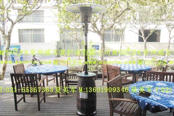 产品特点:1)外观优雅,伞型设计,巴洛克风格,做工精良.2)热效率高,红外线辐射散温,发热量相当于1台5匹空调,使用成本低,因为燃气的热值比电高,所以比空调每小时的使用成本节约40%,升温迅速1到3分钟左右.供暖面积30-150M23)使用环境灵活,可以随意移动,酒店大堂,餐馆,酒吧,户外花园,岗亭,各类展会活动现场等各类休闲场所。4)安全性高,本身设计装有熄火保护,倾倒保护,缺氧保护,让您使用无后顾之忧,更安心更省心更放心。5)无污染,绿色环保。