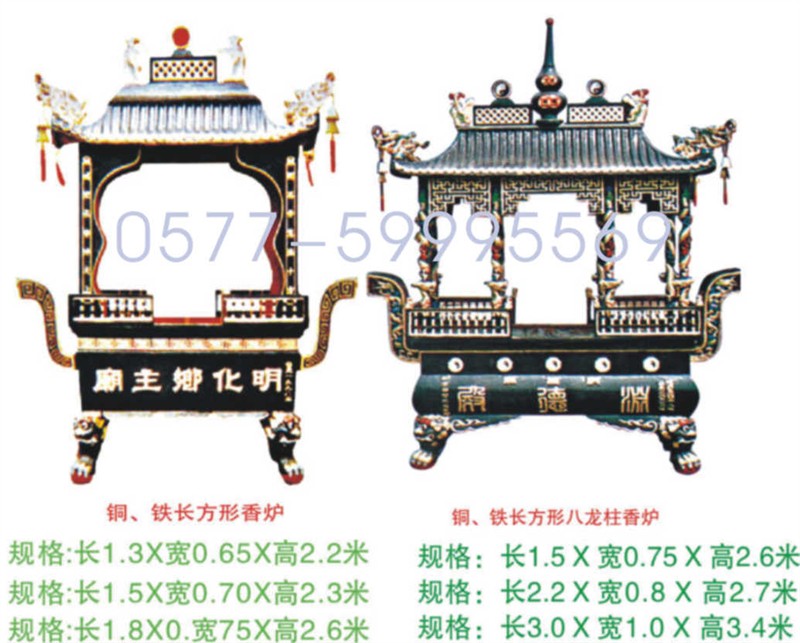 香炉说明:材料分铜、铁两种,规格大小齐全,均可订做,按重量计价,以当下材料价格为准。品名有圆形平口、长方形平口、圆形六龙柱、长方形四龙柱、长方形八龙柱、长方形双层八龙柱、香炉鼎、纸炉、焚经炉。炉面所铸图案文字订方可自行提供,我厂免费为您设计,按要求铸造。更多产品请登陆:http://www.xindagongyi.com