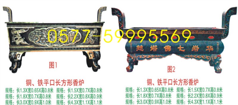 香炉说明:铸铜或铸铁,表面喷漆彩绘,规格大小齐全,按订方要求铸上寺庙/道观名称,功德芳名。按重量计价,以当下材料价格为准款式有圆形平口、长方形平口、圆形六龙柱、长方形四龙柱、长方形八龙柱、长方形双层八龙柱、香炉鼎、纸炉、焚经炉、古宫鼎香炉、八卦炉、圆形狮耳香炉、龙耳香炉、塔炉、方鼎形香炉等。热忱欢迎需要定做法器法物及各类宗教用品的寺庙、宫观、道院、风景区与我们联系,我们一定按照客户的要求设计生产让您满意的产品!咨询电话:13806828740 QQ交流:568681808!更多实物产品展示请登陆:http://www.xindagongyi.com