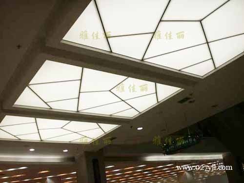 这就是软膜天花,也叫柔性天花、拉蓬天花或者拉展天花。软膜天花在十九世纪始创于瑞士,然后经法国Farmland SCHERRER (费兰德.斯科尔)先生1967年继续研究完善并成功推广到欧洲及美洲国家的天花市场。它由软膜、边扣条、特制龙骨组成。其中龙骨采用铝合金挤压成形,作用是扣住天花软膜;而边扣条和软膜是采用聚氯乙烯材料制成。它质地柔韧,色彩丰富,可随意张拉造型,彻底突破传统天花在造型、色彩、小块拼装等方面的局限性。同时,它又具有防火、防菌、防水、节能、环保、抗老化、安装方便等卓越特性,这一切都是传统天花所不能代替的。因为传统天花易变形,且不防水,一旦被水浸后就会有永久性的水渍,在色彩和造型上也很单一。软膜天花从各方面弥补了传统天花的不足,其优越性是无可挑剔的。