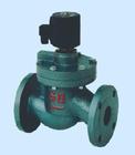本阀是由副阀和主阀两大部件构成的先导式二次开阀的电磁阀。是靠副阀的启闭来控制主阀的通断。根据断电时所处开关状态的不同,可分为常闭电磁阀和常开电磁阀。常闭电磁阀,在断电常位时,副阀口封闭,主阀呈断路,当电讯号进入导阀线圈时,活动铁芯受电磁力作用吸上打开副阀口,主阀阀杯内压力迅速消失,介质压力将主阀杯托上,开启主阀口,工作介质便可流通。但当电讯号消失时,靠主阀弹簧、阀杯自重及介质压力使阀杆下移,严密封住阀口,阀又呈关闭状态。常开电磁阀,在断电常位时,由弹簧作用,副阀口打开,主阀流通。当电讯号进入副阀线圈时,活动铁芯受电磁作用吸下,副阀口封闭,工作介质经平衡也进入阀杯内,当压力趋于平衡时,靠主阀弹簧、阀杯自重及介质压力使阀杯下移,严密封主阀口,阀门呈关闭状态。当主阀断电时,电磁力消失,副阀打开,主阀杯内压力迅速消失,介质压力将主阀阀杯托上,开启主阀口,介质流通,阀呈开启状态。