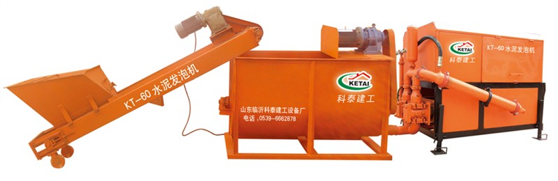 KT-60型水泥发泡机是我厂在借鉴国外先进技术的基础上,结合国内市场应用的实际情况,自主研发、设计生产的属国内首创、真正实现精确计量的、液压全自动大型水泥发泡设备。该设备集液压系统、定量上料系统、搅拌系统、自动发泡系统、输出系统,光电控制系统等为一体,生产出的发泡水泥轻质,气泡细密、均匀,密度可调。