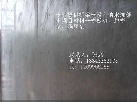 模板漆是一种在脱模效果方面完全超越建筑施工单位使用的机油,色拉油,脱模油,脱模剂,隔离剂,乳化油的一种优质新型脱模剂,使用了模板漆的施工单位时常提到的就是:脱模之后混凝土外观气孔明显减少,光洁度好,都说没见做出这么光亮的混凝土外观,目前主要用于对混凝土外观要求严格的工程,桥梁,隧道。在京沪高铁,石武高铁,大广高速,京石高铁,等各地的环城高速,市政工程,都在使用,优质的水电水利项目,电厂建设等清水混凝土工程。