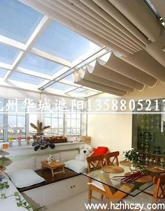 可以是直线,也可以是弧形,运用得当可以基本和建筑曲线相吻合,既遮阳又保持建筑设计的风格。该机构选用系列同步电机,面料中有支撑杆,收拢时呈折叠状,故面料无须承受很大的抗拉强度,对面料的张力要求不高,而且便于安装。最大特点是结构简单,运行平稳,成本低,特别选用于平面,斜面和弧形的框式玻璃结构顶。适用于工程和民用,现已广泛运用于别墅玻璃顶和阳光房的遮阳。
