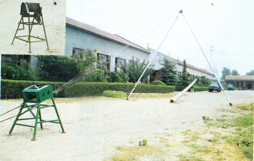 1支起三角架立杆机,中间垂直点正对挖好的线杆坑