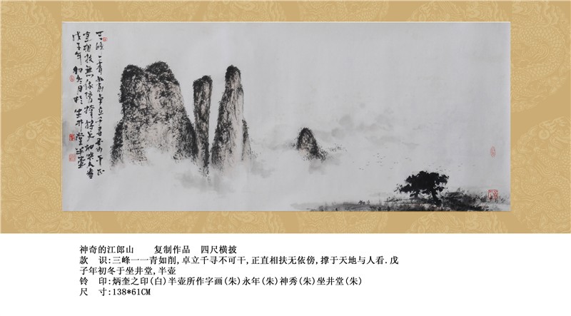 8月初,浙江省衢州市江郎山被列入浙江省第一处世界自然文化遗产。一夜之间,江郎山名气骤增,旅游人数从第二天起实行控制管理。而因此由龙游籍儒商,浙江拉拉美术馆馆长沙二海(徐谷庆)先生限量发行著名山水画家姜半壶先生国画江郎山雄姿的形式庆祝江郎山申请成功的消息,在8月8日被中华人民共和国国家旅游局官网发布,并相继被其它网站转发。沙二海的先生的经营方式也引起旅游业的广泛关注。浙江拉拉美术馆也因此获得了中国。北京以低碳、环保、时尚、和谐为主题的2010年“十全十美”大型集体婚礼活动盛典唯一的书画礼品特供单位。有兴趣的朋友可以在百度中输入关键词“沙二海 江郎山“了解详情。该作品按原大复制 ,限量发行1000份,装裱精美,包装华贵,每件均印有编号,定价2888元。它不仅仅是装饰品,因限量和采用高科技电子分色制作而具有收藏价值空间,订完为止。没兴趣订购的朋友也可收索看看图片,有兴趣的朋友可以直接与我馆联系。