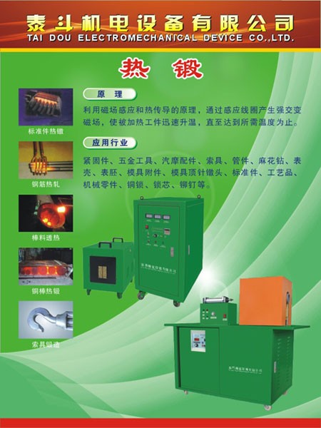 山泰斗机电设备有限公司,是一家集开发、生产、销售、服务于一体的合资企业,全套检测设备从日本和欧美引进。主要电子元器件购自德国,日本及欧美,泰斗机电的技术骨干是由台湾和西安交通大学留美博士等专家组合。他们正在倡导绿色环保节能电源,目前已形成有:晶体式的中、高、超高频感应加热机,高频淬火机床,高频退火机,中频锻造炉,中频熔炼炉,高频釺焊机等一系列的高新技术产品。
