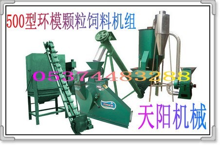 天阳500环模颗粒饲料机组是中大型饲料厂及各饲养场生产各种精饲料的高效饲料加工设备,对于饲料熟化、增加营养、提高吸收率、杀灭病菌、贮存运输、降低成本、节约资源、适应动物的咀嚼功能、提高畜牧养殖效益具有重要意义,为畜牧养殖业的首选。500环模颗粒饲料机组由性能优越的粉碎机、旋流收尘器、螺旋输送机、混料机、颗粒饲料机,斗式输送机,风冷式颗粒干燥机等单机组合而成,集粉碎、混合、提升、制粒、冷却等功能为一体,自动送料、进料迅速、出料顺畅,是一种自动化、高效率、投资少、见效快的中大型饲料机组。500环模颗粒饲料机组生产加工时通过机器自身的摩擦自动升温,使物料糊化、熟化、制粒、冷却一次完成,出机即可包装,颗粒粗细可根据用户的需要,在1.8mm-6mm之内调节,适于加工猪、牛、羊、兔、鸡、鸭、鱼等颗粒饲料, 500环模颗粒饲料机组总装机动力:45 KW工作效率:12-15吨/日 设备价格:53690元/套(定做)。购机免费培训:1.微生物菌种培育技术及发酵秸秆饲料的生产工艺;2.各种禽畜鱼等不同生长期、所需营养成分不同的各种秸秆饲料的配方及直接使用猪、牛、羊、鸡、兔、鱼等畜禽的使用方法。天阳机械金正欢迎您致电13181307932或加QQ578514644咨询。