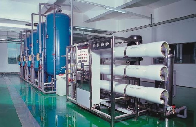 原水 → 原水箱 → 原水泵 →多介质过滤器 (石英砂过滤器)→活性炭过滤器 →软水处理器 → 精密过滤器 → 高压泵 → 一级反渗透(RO)装置 → 纯净水箱 → 高压泵→二级反渗透→紫外线杀菌装置 → 用水点