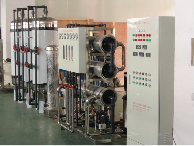 其流程如下:自来水→多介质过滤器→活性炭过滤器→软化水器→中间水箱→低压泵→精密过滤器→一级反渗透→PH调节→混合器→二级反渗透(反渗透膜表面带正电荷)→纯水箱→纯水泵→微孔过滤器→用水点
