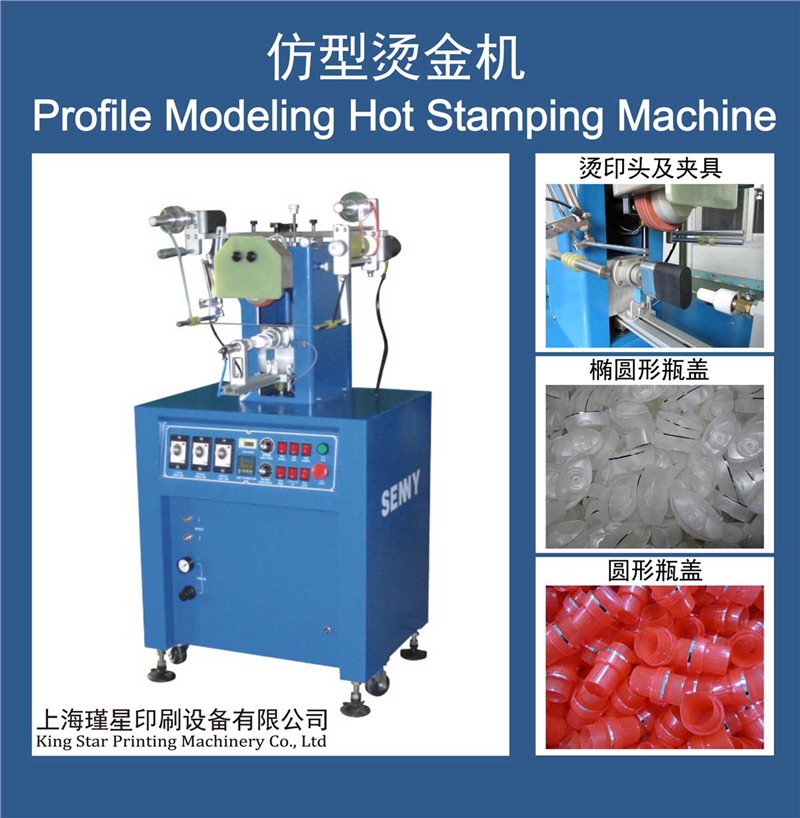 主要性能特点:*烫金轮和走纸系统可以独立调节.*烫金头可以手动角度和前后调节.*调速电机驱动烫金夹具的起点和终点可以方便的任意调节.*烫印压力可以任意调节以至获得最佳烫印效果.*本机适用于圆形、多边形、椭圆形等凭改、化妆品及装饰用品等表面烫金。技术参数:最大烫印直径:Φ100mm最大烫印高度:60mm最快烫印速度:1200pcs/hr 电源及功率:220VAC,50Hz,2KW供气压力:5~6bar外形尺寸:L700xB800xH1200mm