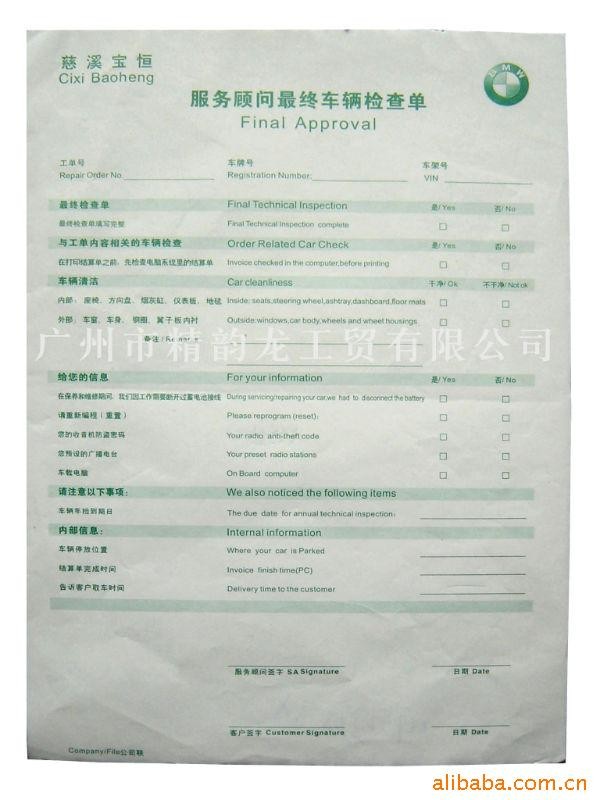 订做BMW,PORSCHE,AUDI,BENZ等汽车售后单据。例如结算单,维修工单,接车单,试车单,检查表等