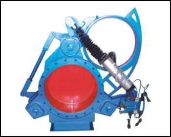 结构特点 :气动扇形盲板阀主要由左阀体、右阀体、丝杠副、阀板、密封圈、杠杆、气缸等零件组成,并由底座、支撑柱构成一个刚性结构体。阀门中设有夹紧、松开气缸和翻板气缸,夹紧、松开气缸通过杠杆副和丝杆螺旋副驱动左、右阀体完成松开、夹紧动作,翻板气缸驱动阀板完成开关动作。橡胶密封圈镶嵌在阀板上,具有耐温高、密封性能好、更换方便、使用寿命长等特点