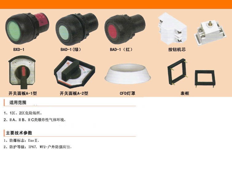 BXD-1防爆防腐按钮 (关键字:防爆防腐产品配件 防爆防腐指示灯 防爆防腐按钮芯 ) 其中产品有BXD-1防爆信号灯,BAD-1防爆按钮,BAD-1内置防爆按钮机芯。防爆净化罩,防爆控制开关面板A-1型,防爆控制开关面板A-2型,CFD灯罩