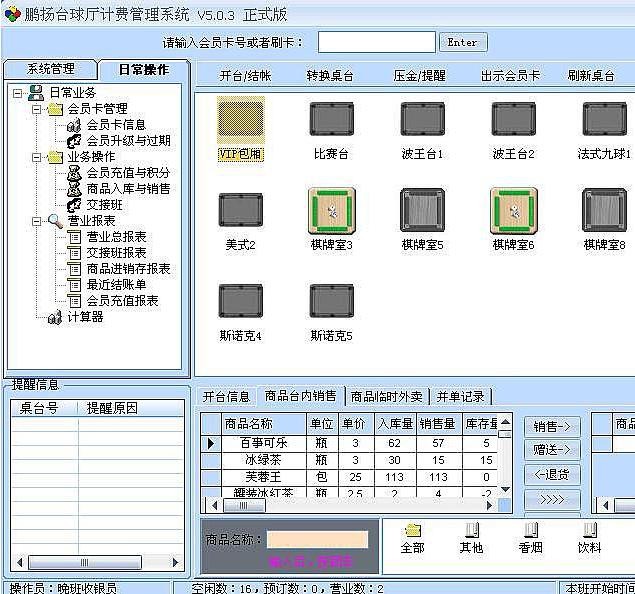 鹏扬台球计费管理系统有开台、结账、打印单据、换台、并台、签单结账、临时打折、交接班、销售商品、电脑灯控、会员打折、会员储值、存款奖励现金、器材出租、陪练等等功能。会员优惠设置很多种,计费方式有四种,计时计局都可以,也支持AA制,就是CUT,还有员工工资考勤管理,丰富的报表,查看每日销售商品明细和桌台收入明细,还可以盘点库存商品,等等。