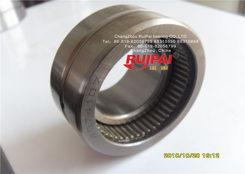 有内圈或无内圈满装滚针轴承该种轴承外圈有油孔,可以从外圈油孔中供油润滑,并带双挡边,内圈无挡边,无保持架,可分别安装内圈,外圈及满装滚针。无内圈满装滚针轴承适用于径向尺寸受限制的部件中,由于无内圈,与配合的轴径表面直接作为滚动面,要求其表面硬度不低于HRC60,表面粗糙度值Ra值不大于0.6除,有内圈或无内圈满装滚针轴承该种轴承不限制轴或外壳的轴向位移。