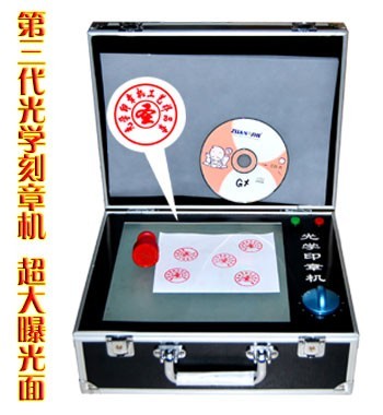 这款机器制的印章盖出来效果不错,但是由于它是由专用的材料光学版制作的,做出来的印章不耐用,1-2个月以后会变形,特别是见水几天以后就会变形,所以建议不用这款机器做的印章开店,此款机器只能用光学版制作印章,光学版本公司常年有售。