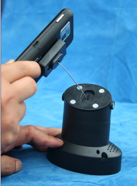产品简介:内部装有可伸缩拉线器,顾客可以自由的拉出手机进行观察和试用,当顾客将样品放回货架时,这个装置内的钢丝绳会自动缩回.并且上面活动部分通过内部磁铁将样品完全回位,从而达到产品有效防护而且又起到了对产品完美陈列。?