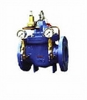 工作原理:水力控制阀分隔膜型和活塞型两类,主要部件有一个主阀及其附设的导管、导阀、针阀、球阀和压力表等组成的。它利用上下游压力差为动力,由导阀控制、使隔膜(活塞)上方控制室内的压力水被排到大气或下游低压区时,作用在阀盘底部和隔膜下方的压力值就大于上方的压力值,所以将主阀阀盘推到完全开启的位置,当进入隔膜(活塞)上方控制室内的压力不能排到大气或下游低区时,作用在隔膜(活塞)上方的压力值就大于下方的压力值,所以就会把主阀阀盘压到完全关闭位置,当隔膜(活塞)上方控制室内的压力值处于入口压力与出口压力中间时,主阀阀盘就处于调节状态,其调节位置取决于导管系统中的针阀和可调导阀的联合作用。可调导阀可以通过下游的出口压力并随它的变化而开大或关小其自身的小阀口,从而改变隔膜(活塞)上方控制室内的压力值,控制主阀阀盘的调节位置。