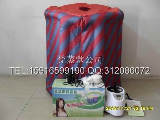 1.将桑拿浴箱下孔接通电动充气泵,充气至气柱直立,切勿充气太足;