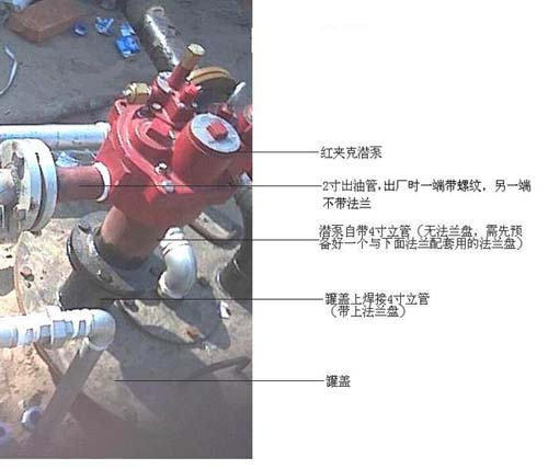 4、人孔上开孔内径是108MM的,焊接一段4寸立管高200MM,要求和油罐中心线垂直,准备一对标准4寸法兰,一片焊接在立管上,另一片焊在泵上带的立管上。法兰对接安装。