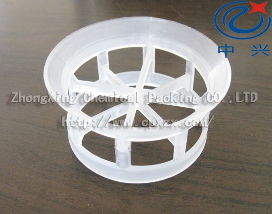 塑料阶梯环(材质:PBT,PE,PP,PVC,CPVC,PVDF)应用于合成氨厂脱碳、脱硫系统、原油分离常减压装置各种分离,例如甲醇分离,有机酸分离等吸收及脱吸塔等。塑料阶梯环环壁上开有窗孔,环内有两层十字形翅片,两层翅片交错45°。因为环壁一端有向外翻卷的喇叭口,造成形状不对称,在填料床层内减少了料环的相互重叠,增大了空隙率。同时使塑料阶梯环的表面得以充分利用,可使压降降低,传质效率提高。可以在压力低至0.1mm汞柱中工作使用,抗污性能好,最小喷淋密度低。