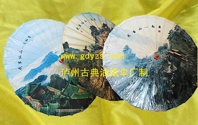 泸州古典油纸伞厂专业订做旅游风景图油纸伞。把当地代表性风景做在油纸伞上,携带方便,新颖独特,文化气息浓厚,深受旅游爱好者喜欢。