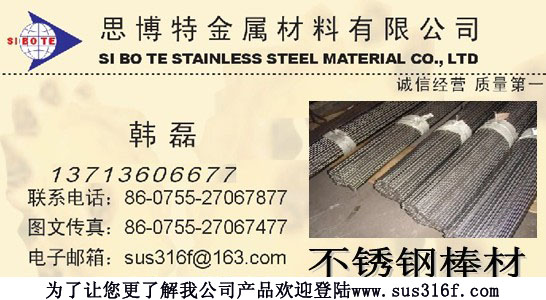 深圳思博特专业生产:304不锈钢棒,316不锈钢棒,主打产品还包括:不锈钢带,不锈钢棒,不锈钢管,不锈钢板,螺丝线,弹簧线,车轴线,光亮线,全软线,产品线,不锈钢丝,钢丝绳,六角棒,异型材等,产品材质有:SUS310S,309,316L,316F,316Ti,316,321,304L,305,304,303,302,301,202,201,430,416,430F,420,410, 630,17-4PH,631,17-7PH等!