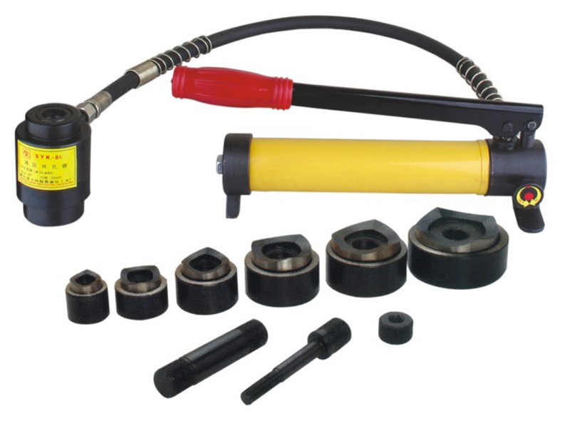 SYK系列液压开孔器,是一种能在4mm以下的金属板 上开孔的先进手动液压工具,能够起到一般冲压设备所不能 达到的开孔作用。其操作简便、省力、速度快、加工面平整 光洁,也不受场地,位置限制均可使用,安全可靠。液压开 孔器结构轻巧、美观、易携带、可供冶金、石油、化工、电 子、电器、船舶、机械等行业安装维修电线管道、指示灯、 仪表开关等的开孔,更适用于已成型的仪表面板底板,开关 箱分线电器盒的壁面开孔之用。