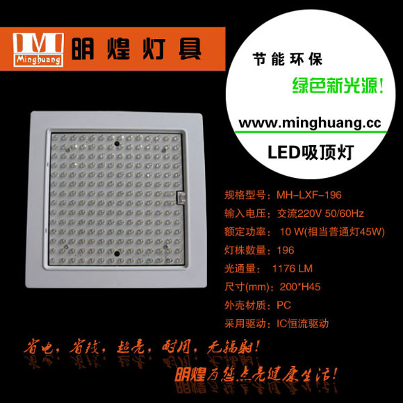 本产品采用进口高亮冷光源LED灯株,高亮,省电,省钱,无辐射,环保耐用,外观设计典雅大方,吸顶式安装(可用于家居照明,酒店宾馆,学校,医院,商务办公楼等场所)