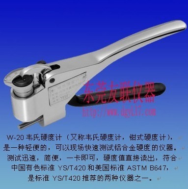 W-20韦氏硬度计(又称韦氏硬度计,钳式硬度计),是一种轻便的,可以现场快速测试铝合金硬度的仪器。测试迅速,简便,一卡即可,硬度值直接读出,符合中国有色标准YS/T420和美国标准ASTM B647,是标准YS/T420推荐的两种仪器之一。