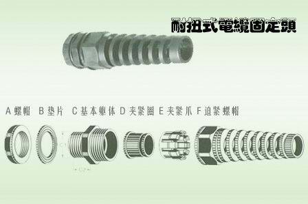 产品特性:特殊夹紧爪与夹紧圈之设计,夹紧电缆范围大,抗拉力特强,可防水、防尘、抗盐、耐弱酸、酒精、油、油脂及一般溶剂