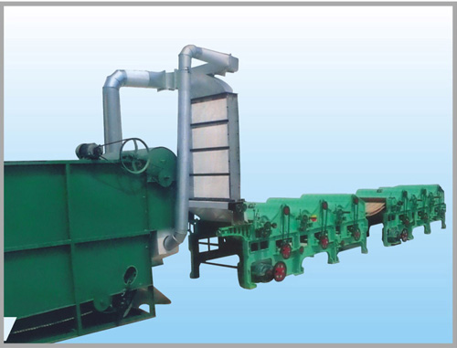 该机由两台风机型开花机和两台三辊清弹机连接而成,本机节省人工,一个 班只用两个工人,在开花机设置尘笼吸风后,棉花开出纤维长,粉头少,棉花清等特点。