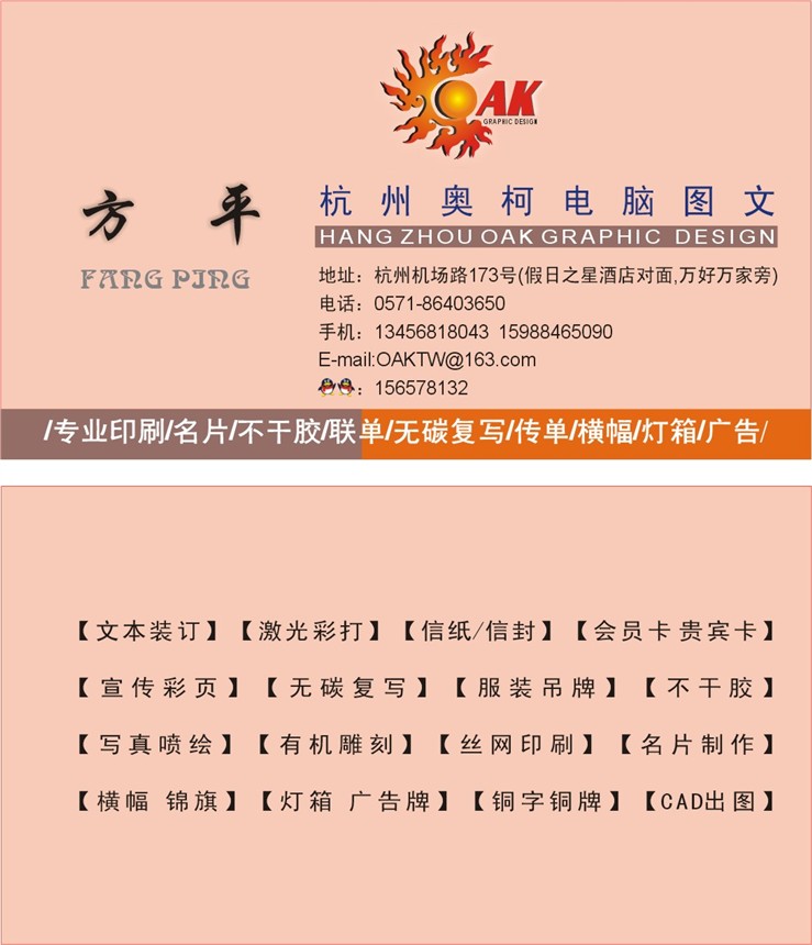 杭州奥柯图文有限公司于2003年5月8日在杭州杭州市机场路173号注册成立,(行政区号330103,邮政编码310014),公司成立之初主要经营经营广告业务,注册员工人数为10人,注册资本30万元人民币,本公司自成立以来,主要从事文本装订、广告设计、有机雕刻、制作安装,各类胸牌、名片(亚膜、亮膜、烫金、UV等各种特殊工艺)、写真、喷绘、锦旗、横幅等一条龙服务,本着诚信为本,顾客至上的原则,多年来深受广大新老客户的好评。