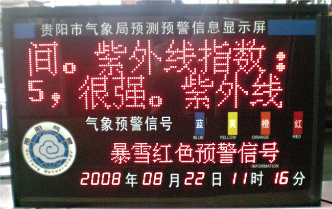 恒光达气象显示屏内含恒光达GSM无线模块,可实现远距离 、定时、自动传输,有四色预警图表,包含中国气象局的所有预警符号