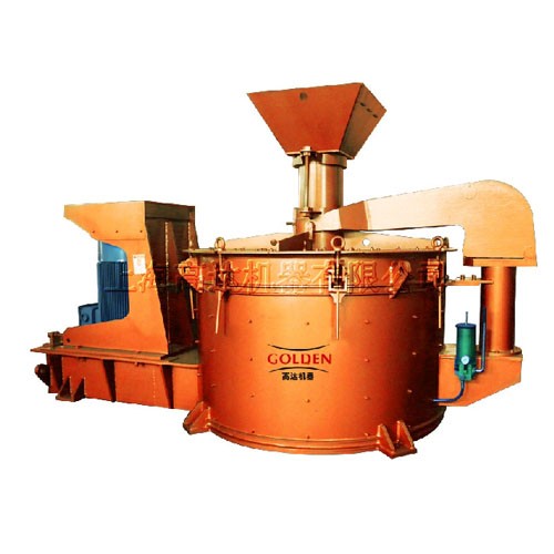 石料由机器上部直落入高速旋转的转盘,在高速离心力的作用下,与另一部分以伞型方式分流在转盘四周的靶石产生高速度的撞击与高密度的粉碎,石料在互相打击后,又会在转盘和机壳之间形成涡流运动而造成多次的互相打击、摩擦、粉碎、直至粉碎成所要求的粒度