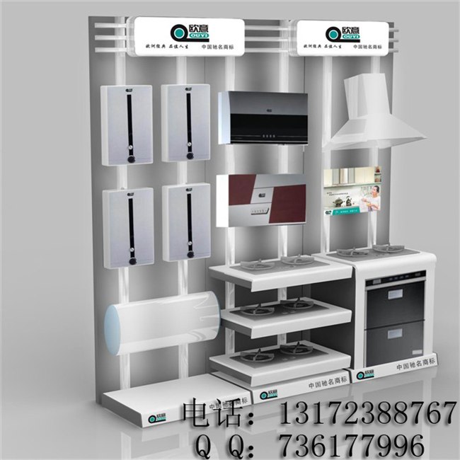 本产品用铝合金和高密度中纤板组合而成的烟机/炉灶/消毒柜为一体的促销礼品展示柜