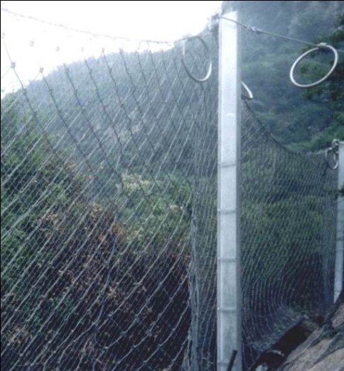 SNS被动防护网由钢丝绳网或环形网(需拦截小块落石时附加一层铁丝格栅),固定系统(锚杆、拦锚绳、基座和支撑绳)、减压环和钢柱四个主要部分构成。