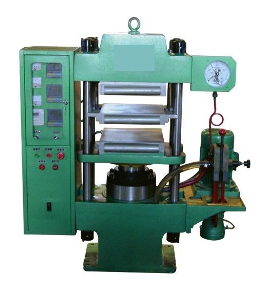 特点及用途:本机为25吨平板硫化机,适用于压制各种模压制品,如压橡胶和塑料,也适用于薄片制品。本机床为四柱式整体结构,压制型式为下(向上)压式,分主机,油箱和电控箱三部分。主机装有柱塞,油缸,固定平板,活动平板等部件。油箱有油泵,管道,阀等部件。油泵有电动机带动,电控箱装有按钮开关,磁力启动器,计时报警器,制动控温仪,过载保护器等。当电动机过载能自动切断电源,电加热由自动控温仪分三路控温,能在20-200度范围内任意调节,当达到温度后,电路能自动保持恒温,达到设定的硫化时间后,自动报警。