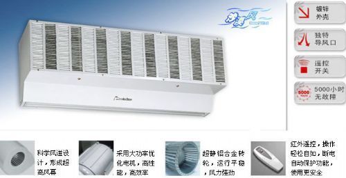 风幕机又称空气幕、风帘机、风闸、空气门,英文名称:air curtains、air door、air curtain,风幕机产品广泛应用于工厂、商店、餐厅、药店、冷库、宾馆、医院、机场、车站等环境的出入口上及一切装有空调器的场所,应用特制的高转速电机,带动贯流式、离心式或轴流式风轮运转产生一道强大的气流屏障,能有效的保持室内空气清洁,阻止冷热空气对流,减少空调能耗,防止灰尘、昆虫, 及有害气体的侵入,提供一个舒适的工作、购物、休闲环境