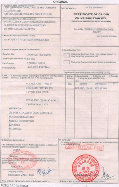 4、原产地证书应由出口成员方的相关政府机构根据《中国-巴基斯坦自由贸区原产地规则》在产品出口前、出口时或在出口后15天内签发。在特殊情况下,如由于非主观故意的差错、疏忽或其他合理原因没有在货物出口前、出口时或出口后立即签发原产地证书,原产地证书可以在货物装运之日起一年内补发,但要注明“补发”(ISSUED RETROACTIVELY)字样。